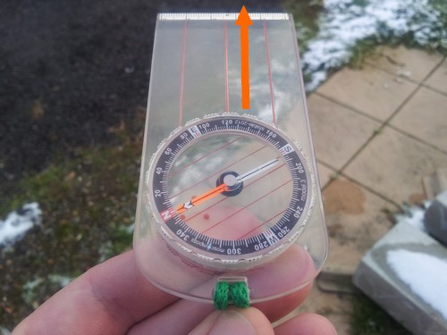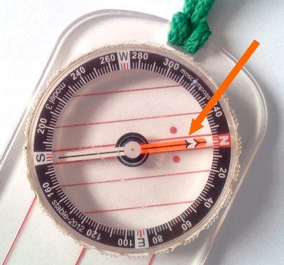 Une fois que vous avez défini votre cap, vous allez regarder dans la direction indiquée par la flèche de direction, gravée sur la plaquette, pour repérer un point particulier reconnaissable. Ca peut être un arbre (comme dans notre exemple), ou bien un rocher, ou tout autre objet qui se détache. L'intérêt de ce point particulier est d'être situé exactement dans la direction que vous voulez utiliser. Une fois l'objet repéré, vous allez jusqu'à ce point sans tenir compte des écarts que vous pouvez faire pour y arriver. Même si vous avez du contourner une mare, vous savez que lorsque vous arriverez à l'arbre que vous avez repéré vous serez revenu exactement sur un point qui est sur la bonne trajectoire. A partir de ce nouveau point, reprenez une visée vers un autre point (sans dérègler votre boussole) et ainsi de suite.
