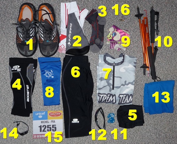 Après on peut optimiser la tenue elle-même en investissant dans des tenues "spécial désert" proposées par les équipementiers, vous savez les tenues anti UV, anti transpiration, anti mauvaises odeurs (on en reparlera quand vous aurez couru 6 jours avec), mais très franchement, j'ai du mal à voir en quoi cela aurait pu influencer mes performances. Sur d'autres sujets ça peut avoir un impact, mais sur la tenue de course, si vous prenez une tenue dans laquelle vous êtes bien à la base, cela est en général suffisant
