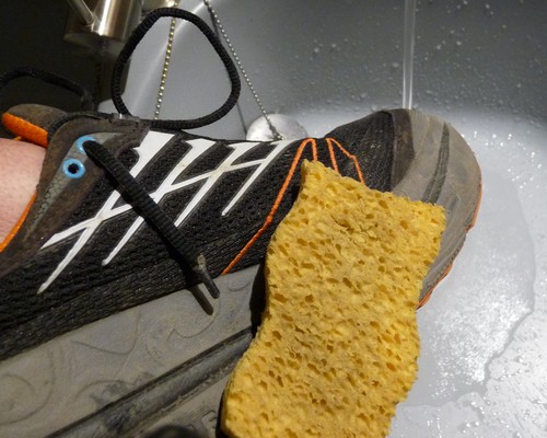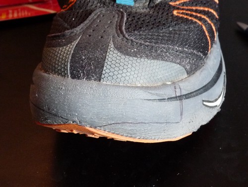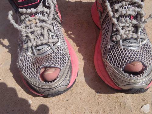 Une technique assez courante consiste aussi à découper ses chaussures à l'avant et ou sur les cotés. Cela permet bien sur de gagner de la place les derniers jours pour gérer les pieds qui gonflent et les pansements, mais aussi de laisser sortir le sable facilement partant du principe que plutôt que d'essayer d'empêcher le sable de rentrer, autant lui faciliter la sortie ! Ca se défend !