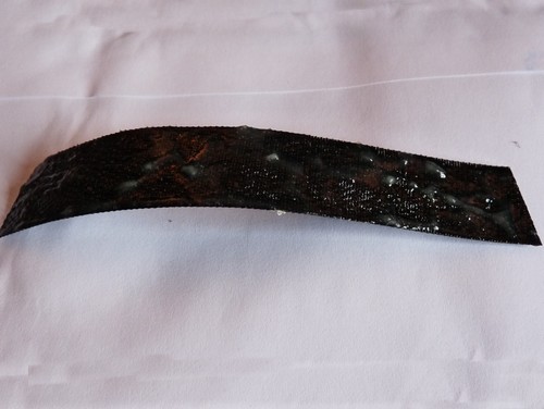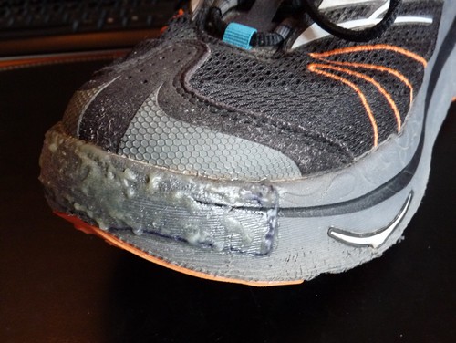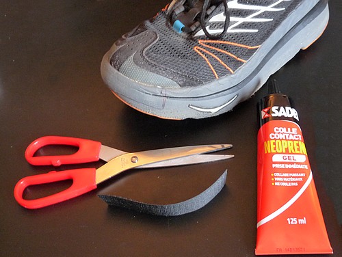 Pour cette dernière, j'avais utilisé la fois précédente de la colle araldite à 2 composants. Elle présentait l'intérêt d'avoir un temps de prise et de sèchage assez court ce qui m'avait permis de monter les deux chaussures en une soirée. Ldéfaut de cette colle est qu'en séchant, elle devient solide, presque cassante. Elle est bien adaptée aux collages qui ne demandent pas de flexibilité ou de mouvement, ce qui n'est pas le cas sur les chaussures où, à chaque foulée, il y a un peu de déformation de la semelle.