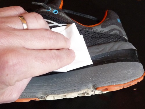 On enduit la zone délimitée avec une couche de colle néoprène. Si les chaussures sont neuves, il peut être intéressant de gratter un peu le caoutchouc pour le rendre un peu plus adhérent. La couche n'a pas besoin d'être trop épaisse, juste un peu "grasse". En fait il s'agit surtout de suivre les instructions du fabriquant de la colle.