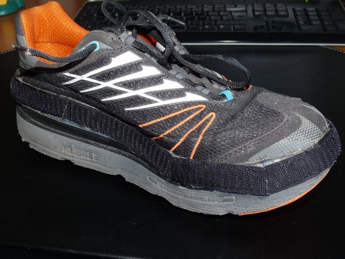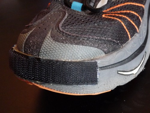 La particularité des Hoka c'est d'avoir une semelle imprtante, donc de la surface où poser le velcro (quand on le colle). Par contre attention à ne pas le coller sur la partie basse car c'est celle qui s'écrase le plus, et du coup le collage risque de moins bien tenir, mais on va y revenir
