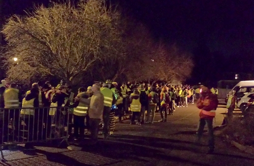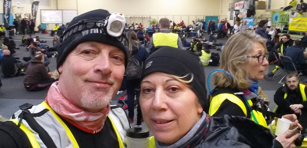 Trajet tranquille vers Maule ou on espère pouvoir attendre au chaud dans un gymnase. Erreur. Ici on est à la dure. Descente du bus, puis passage au pointage et au contrôle de départ. 2 petits barnums posés sur un parking. Contrôle des cartons, tamponnage, vérification des gilets jaunes et des frontales. Le règlement c'est le règlement, les organisateurs ont reçu des consignes strictes.
