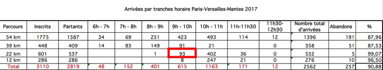 Quelques jours plus tard, l'organisation publie ses statistiques d'arrivée (pas de classement, souvenez vous, ce n'est pas une course). La lecture de ces stats sont plutôt agréables. En 3h40 avec un départ réel à 6h10, on termine dans la tranche arrivée entre 9h00 et 10h00, soit dans les 100 premiers, ce qui pour une première participation est un résultat largement satisfaisant.