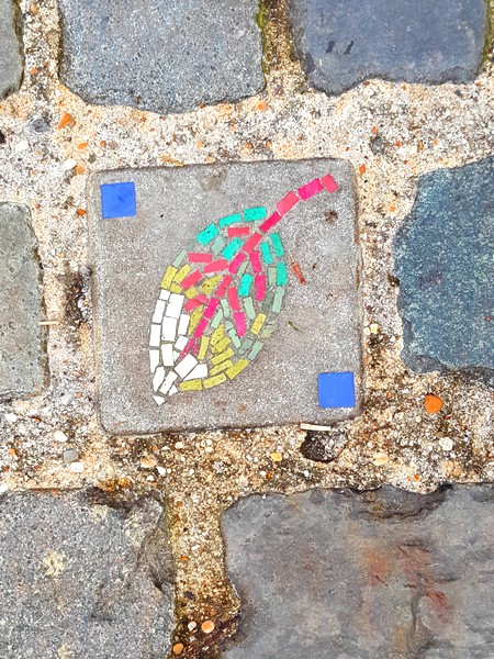 Depuis la balise 12 je suis les instructions du tracé jusqu'à une rue où je trouve les mosaïques au sol. Je trouve le crâne fumant, puis je cherche la seconde mosaïque après le crâne, pour trouver une feuille. Le code serait donc UIL si je prends les 3 lettres du milieu