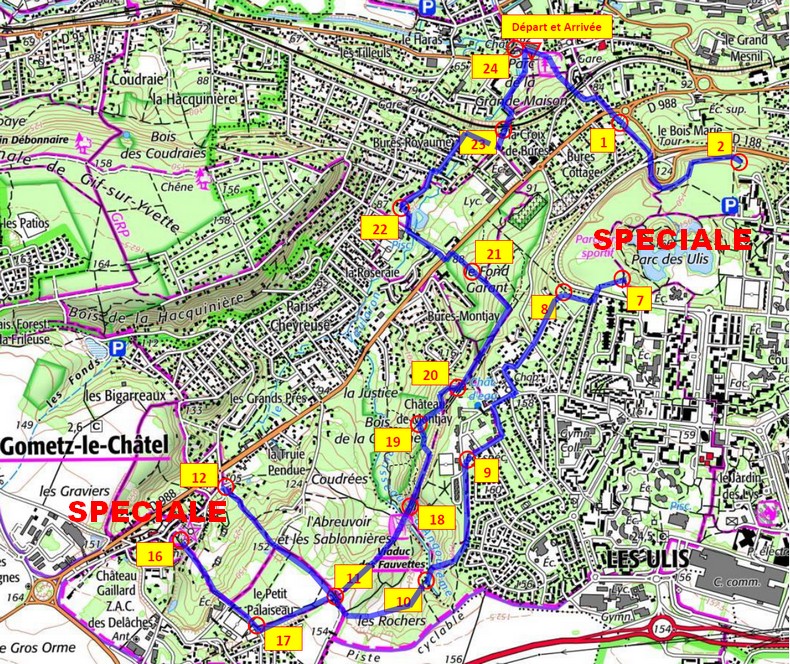 Pour réaliser ce défi, je décide d'aller me garer vers la croix de Bures comme lors du défi 4, et de modifier un peu l'ordre de prise des premières balises que j'ai reporté sur la carte grâce au road book. Je prévois dès le départ de faire 23-24- puis j'enchaînerai le reste normalement avec 1-2-3...22
