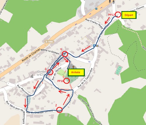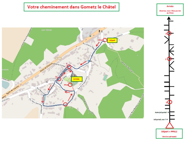 Je continue le tracé dans le centre du villages pour arriver à l'intersection où se situe la balise 14 et le code C2