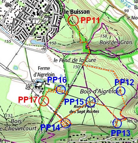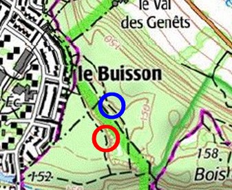 Pour PP11, l'analyse post sortie montre que je ne l'avais pas placée au bon endroit (en bleu). J'ai bien tenu compte de la position au sud de "buisson" mais pas à la limite de département. Du coup la balise est probablement située dans le cercle rouge
