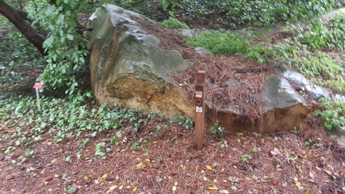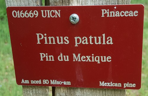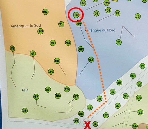 Sur ce panneau il faut trouver le Pinus Patula et voir où il se trouve dans l'arboretum. Grâce aux indications je le situe au n° 81, moi je suis au niveau de la croix rouge. Pour me repérer je vais utiliser l'alternance des arbres 35 et 37 puis remonter dans la zone plantée en repérant les arbres spécifiques sur mon tracé. Comme ils sont étiquetés, c'est plus simple.