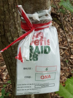 Je vais utiliser des allées pratiquement plein ouest, aucune difficulté. Arrivé sur place j'identifie l'arbre, et cette fois la balise est bien là. Par contre la pluie a redoublée, et comme j'ai mes lunettes et pas de lentilles, je ne vois plus grand chose.