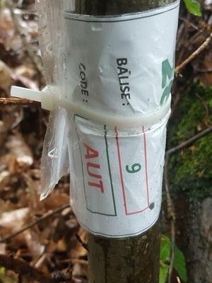 De là je me rends à la fin du parcours geocaching que je commence au niveau de la clôture. Je fais encore 2 passes. Une le long de la clôture jusqu'à la bièvre malgré la végétation et une autre passe sur la butte qui longe la clôture, mais dans les deux cas sans résultat. Pas grave elle est probablement dans la prairie. Les herbes sont hautes et elle est peut être cachée, d'autant qu'en agrandissant le plan j'ai remarqué que la trace faisait un petit crochet. Là, je visite à nouveau chaque arbre, chaque souche et chaque trou sans rien trouver. Je reste longtemps, mais rien dans cette zone. Finalement je décide d'aller vers la zone de la balise 3 lorsque je trouve un morceau de rubalise sur une branche mais sans balise. Je fais une photo, on ne sait jamais, c'est peut être la balise, mais elle a pu être arrachée. En fait non, ce n'est pas le cas (je le saurais plus tard), mais ca aurait pu.