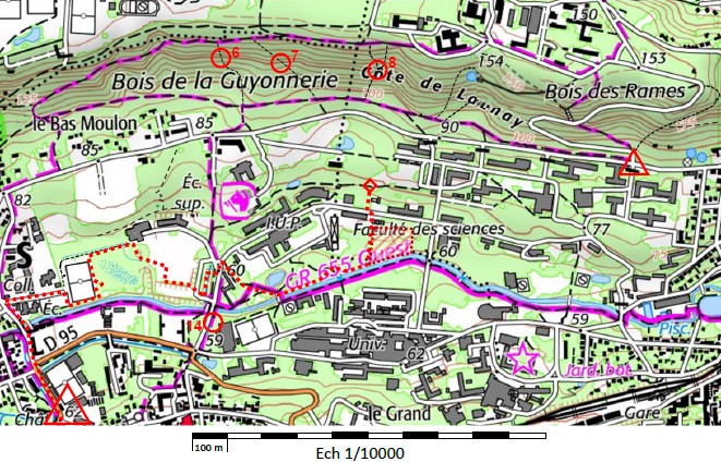 Depuis l'entrée du la fac, je contourne le premier bâtiment et je pars plein ouest jusqu'au bâtiment suivant que je contourne par le nord pour arriver sur PP11. Je trouve la falaise, mais encore une fois, aucune balise Raid28. Ca commence à m'agacer sérieusement