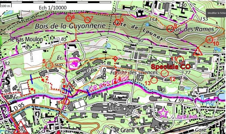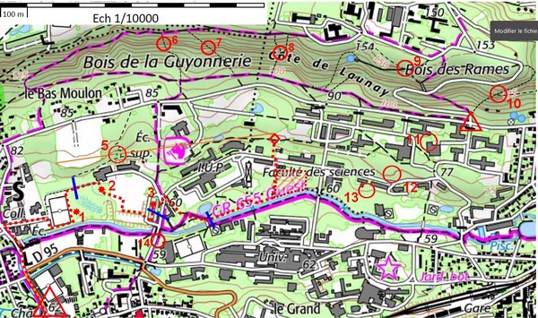 Puis j'ai reporté ces sections, les balises manquantes et les balises de la carte 2 sur la carte générale. J'aime bien avoir une vue d'ensemble. Il ne manque que les balises du geocaching que je ne pourrai reporter qu'une fois sur place.