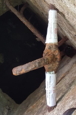 Il ne reste plus que PP28. S'agissant d'un regard latéral, il faut remonter tout en haut de l'aqueduc. Pendant la montée je cherche sans le trouver le fameux regard. Arrivé en haut je décide de passer sur l'aqueduc, au cas où, jusqu'au petit pavillon qui ferme l'accès à la partie la plus élevée, mais rien. Je commence à redescendre mais là encore je ne trouve rien. Allez, on tente une nouvelle fois vers le haut, mais en allant plus loin ce coup-ci, et là je trouve une grille avec la balise attachée à une branche à proximité.