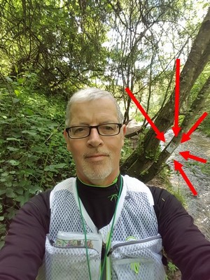 On trouve le sentier qui va nous faire redescendre vers la Bièvre, puis on va jusqu'à la passerelle. Là je vais suivre le sentier qui remonte jusqu'à une souche que j'ai failli louper, puis commence un petit exercice de précision en mode azimut distance pour récupérer la balise