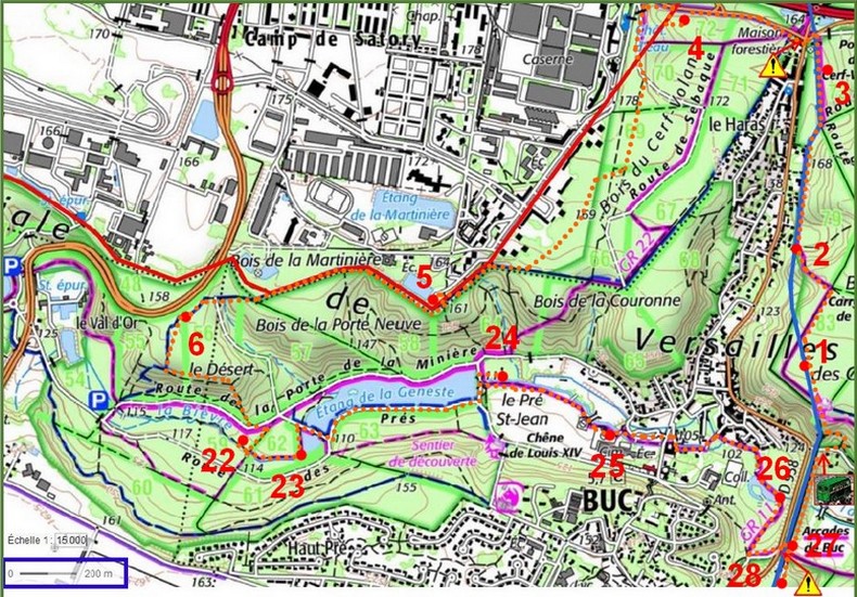 Avec tout ça, on se lance donc dans une chasse aux balises 1 à 6 puis 22 à 28. Le tracé et en pointillés oranges sur la carte ci-dessous