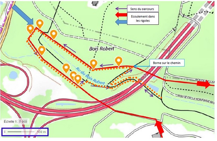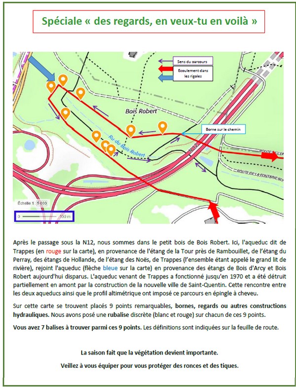 Je continue ma montée puis je prends la route des sangliers puis le chemin qui pars vers l'ouest pour aller attaquer la spéciale de Bois Robert. Sur cette spéciale il va faloir suivre le tracé de l'aqueduc et trouver des regards, mais tous les regards ne sont pas porteurs d'une balise (cf. la définition de la spéciale)