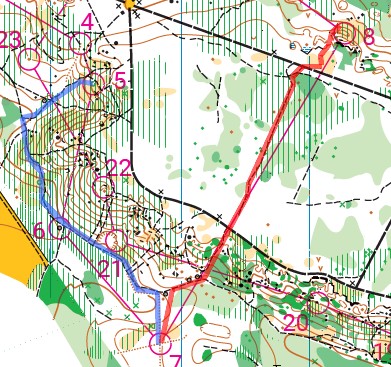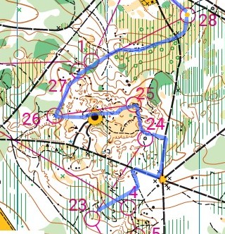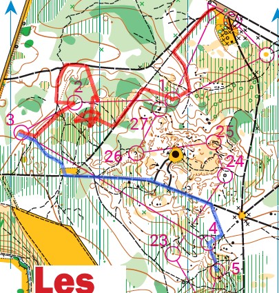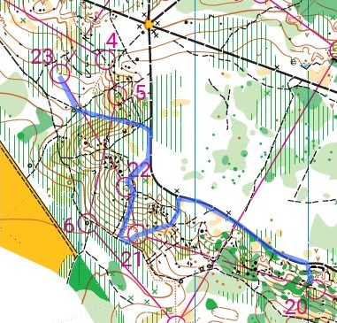PP23 - Butte : Plusieurs choix possibles. On décide de remonter sur le grand chemin, puis à l'intersection on trouve le sentier qui va vers le poste. Après l'intersection en bas du dévers, on trouve la borne qui nous rassure sur notre emplacement. A la fourche suivante, on attaque la balise à l'azimut. Bingo, ou plutôt DING !
