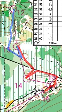 Aïe... bon c'est quelque part entre ici et PP02 puisqu'elle a fait une photo avec sur place. On va donc refaire le chemin à l'envers. On retourne a PP02 sans rien trouver, même en essayant de le faire sonner. Après un bon moment de recherche sans résultat on décide de reprendre la CO. On retourne vers PP03 et au moment où on passe la ravine juste avant le poste on tombe sur le téléphone... Ouf sauvés.