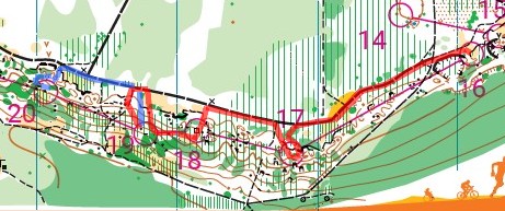 PP17 - Rentrant : Là l'interposte justifie que nous revenions sur le chemin. On le remonte vers l'ouest jusqu'à l'endroit dégagé où il fait un coude et on s'avance un peu après le second chemin qui arrive de notre droite. Comme pour les 4 balises qui suivent, je dois avouer qu'on y est allé un peu au flair. En l'absence de vraies balise permettant de savoir qu'on était au bon endroit on a fait au plus précis et on a ratissé la zone jusqu'au DING