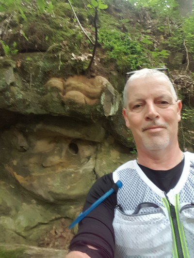 De là je suis le premier chemin qui me fait rejoindre la piste forestière, puis lorsque la piste fait un coude vers la droite, je prends le sentier qui part à flanc de coteau. Sur le chemin impossible de rater le fameux rocher. Pour trouver la balise il faut aller se glisser dessous, presque à plat ventre.