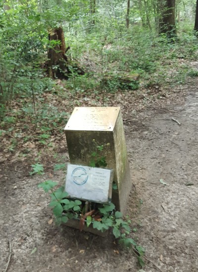 PP08 : Départ depuis le parking. Je rentre dans la forêt, et je descends rejoindre le grand chemin orienté est-ouest. Je pars vers l'ouest et un peu plus loin je trouve le sentier qui va sur la stèle où se trouve la plaque et l'inscription permettant de définir le code de la balise
