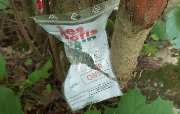 Celle là va me poser un petit soucis. Non pas que la progression soit difficile, au contraire c'est même assez simple, mais d'après la carte elle se situe à la première intersection de fossés, hors quand j'arrive à l'intersection, je ne trouve pas de balise. Je fais 4 fois le tour de tous les arbres, sans rien trouver, et je vais même jusqu'à faire des photos de toute la zone pour envoyer à l'orga à mon retour. Puis, en me souvenant des défis précédents, je décide par sécurité de continuer un peu plus loin dans la rigole, et voilà que je trouve une seconde intersection de fossés avec la balise bien présente...
