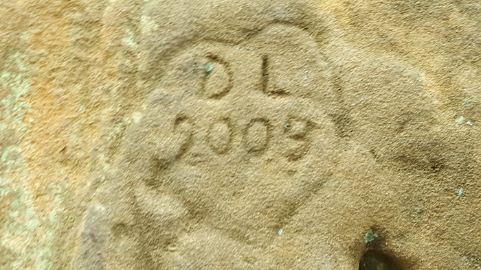 Rejoindre le dolmen est un jeu d'enfant puisqu'il est indiqué par des panneaux depuis le grand chemin. Sur place je cherche les initiales gravées que je trouve facilement. "DL 2009". A partir de là je vais suivre les indications de la définition pour calculer le code (le mot en question est bien dur Dolmen) LERD
