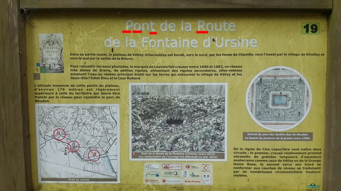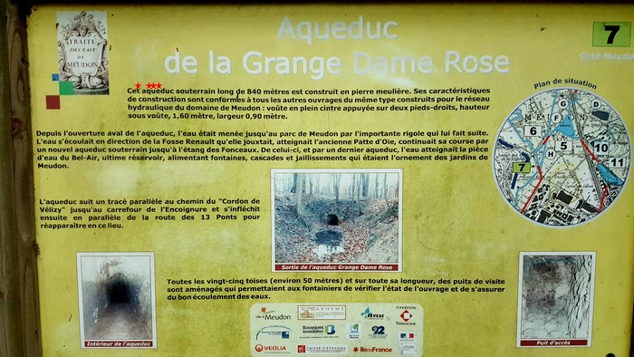 PP19 - Balise placée sur la carte B, Aqueduc de la Grange Dame Rose, panneau proche de sa sortie, le code est la suite des lettres de rang 3, 7, 5, 6 de la première phrase sous le titre