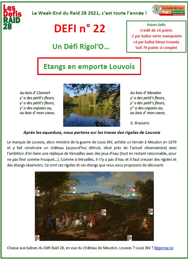 22ème défi, et cette fois c'est à la chasse de 28 balise que nous allons partir sur la trace des rigoles de Louvois. Le road book est assez dense avec plusieurs cartes, des définitions et pas mal de vignettes. Ce défi peut quand même rapporter 70 points supplémentaires au classement.