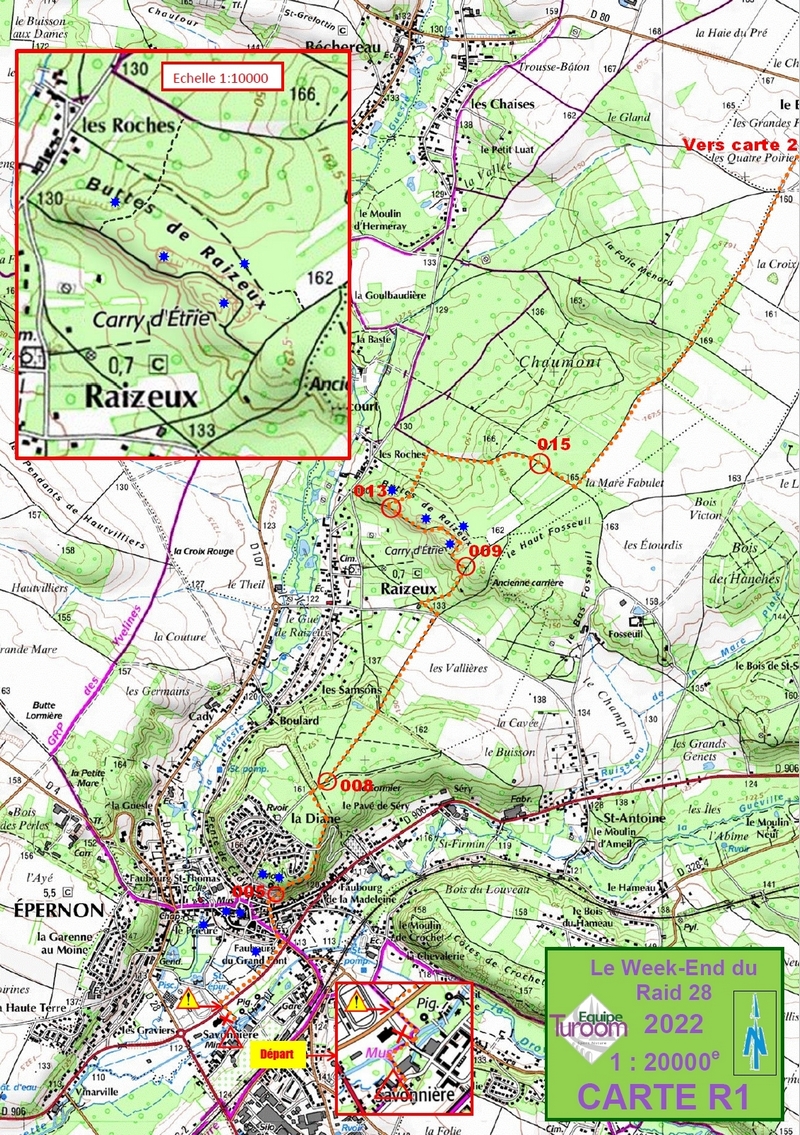 Le parcours commence par une série de 4 balises bleues (PP001 à PP004) sur la spéciale "La cadastrale d'Epernon" au milieu de laquelle se trouve la balise verte PP005.