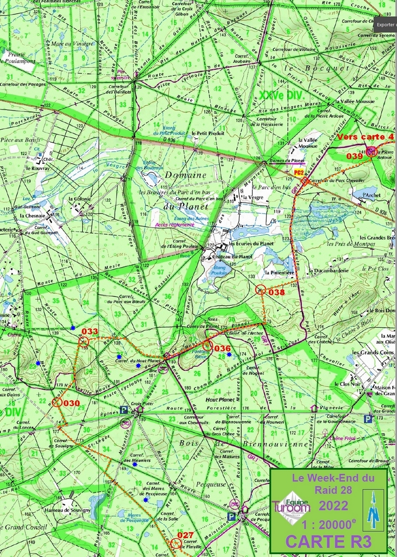 On quitte la balise par le sud histoire de contourner le chateau de Méridon (lieu connu des orienteurs) puis on rejoint le PC situé à la traversée de la route. Ce PC correspond à la seule barrière horaire de la course. On devait passer ici impérativement avant 12h30, et il est 10h45. On a 1h45 d'avance sur la barrière, et du coup il nous reste 4h15 pour faire les 15 derniers kilomètres